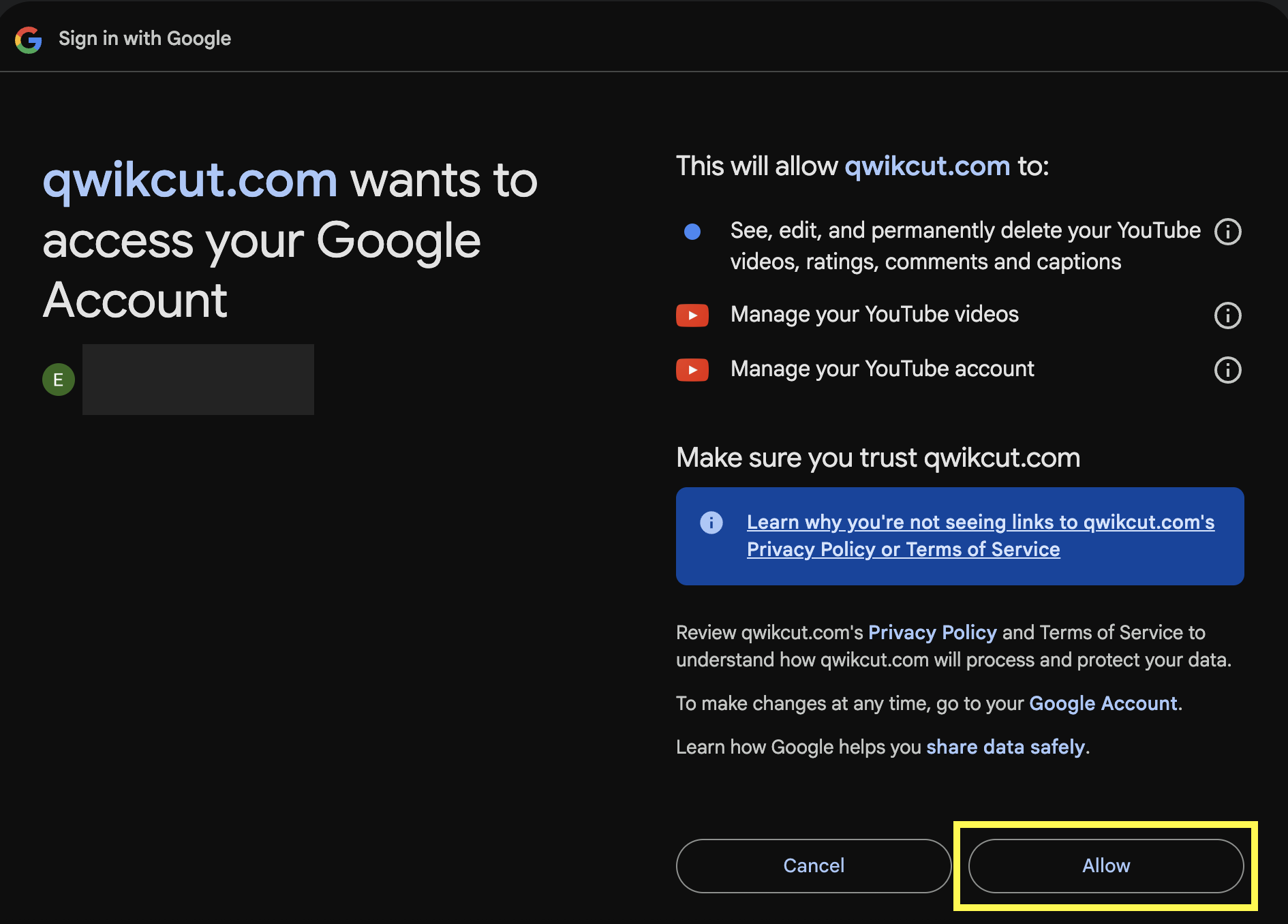 5.) Select Allow on the right side of the screen to finish linking your QwikCut account to your YouTube.